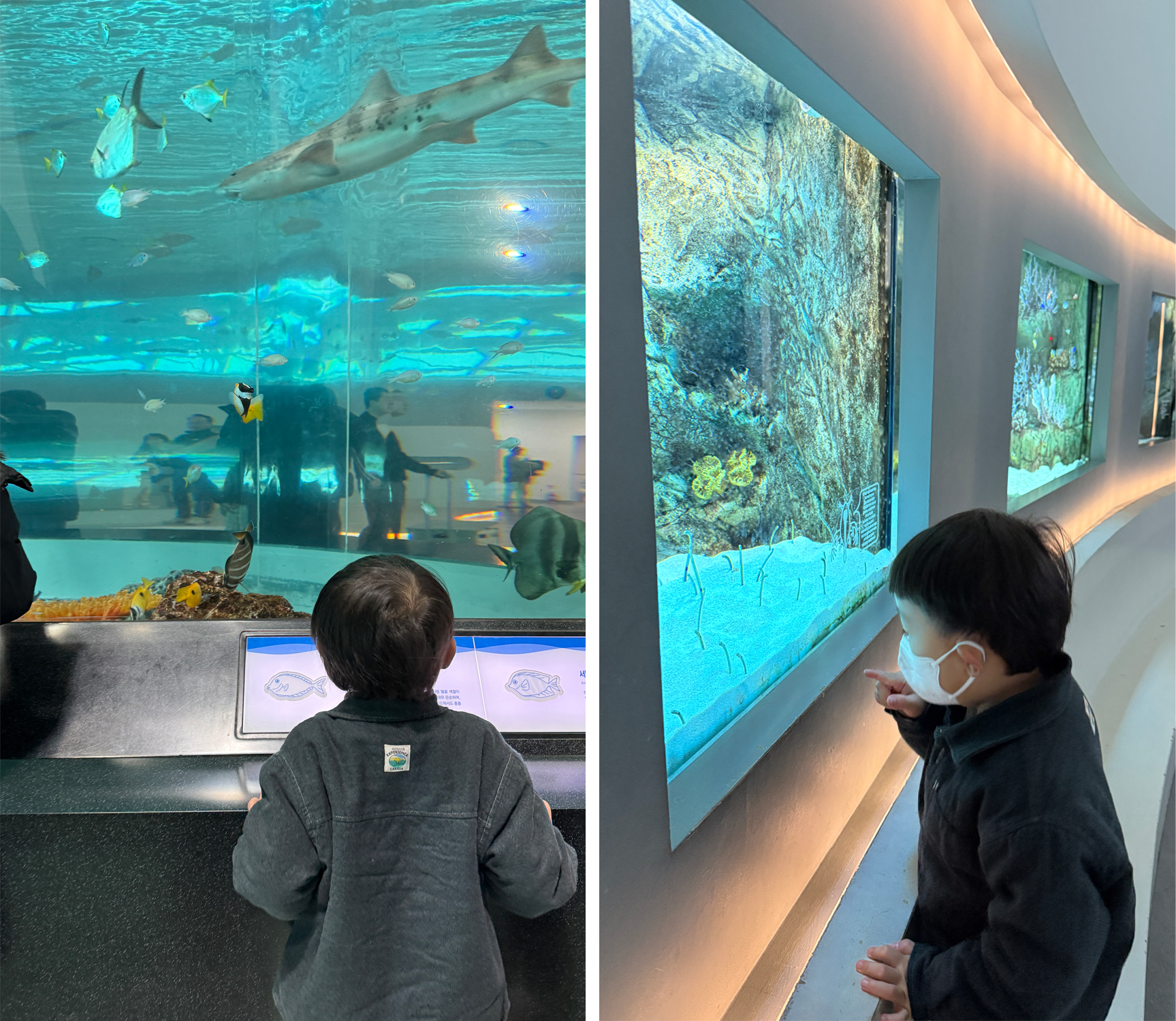 물품보관소에 짐을 맡기고 3층으로 올라가니 수족관이 있어 물고기를 구경하고, 바다 전망이 보이는 카페에서 간식을 먹었습니다. 점심은 부산역에서 먹기로 하고, 한시간 반 정도 박물관에서 시간을 보낸 후 다시 버스를 탔습니다.