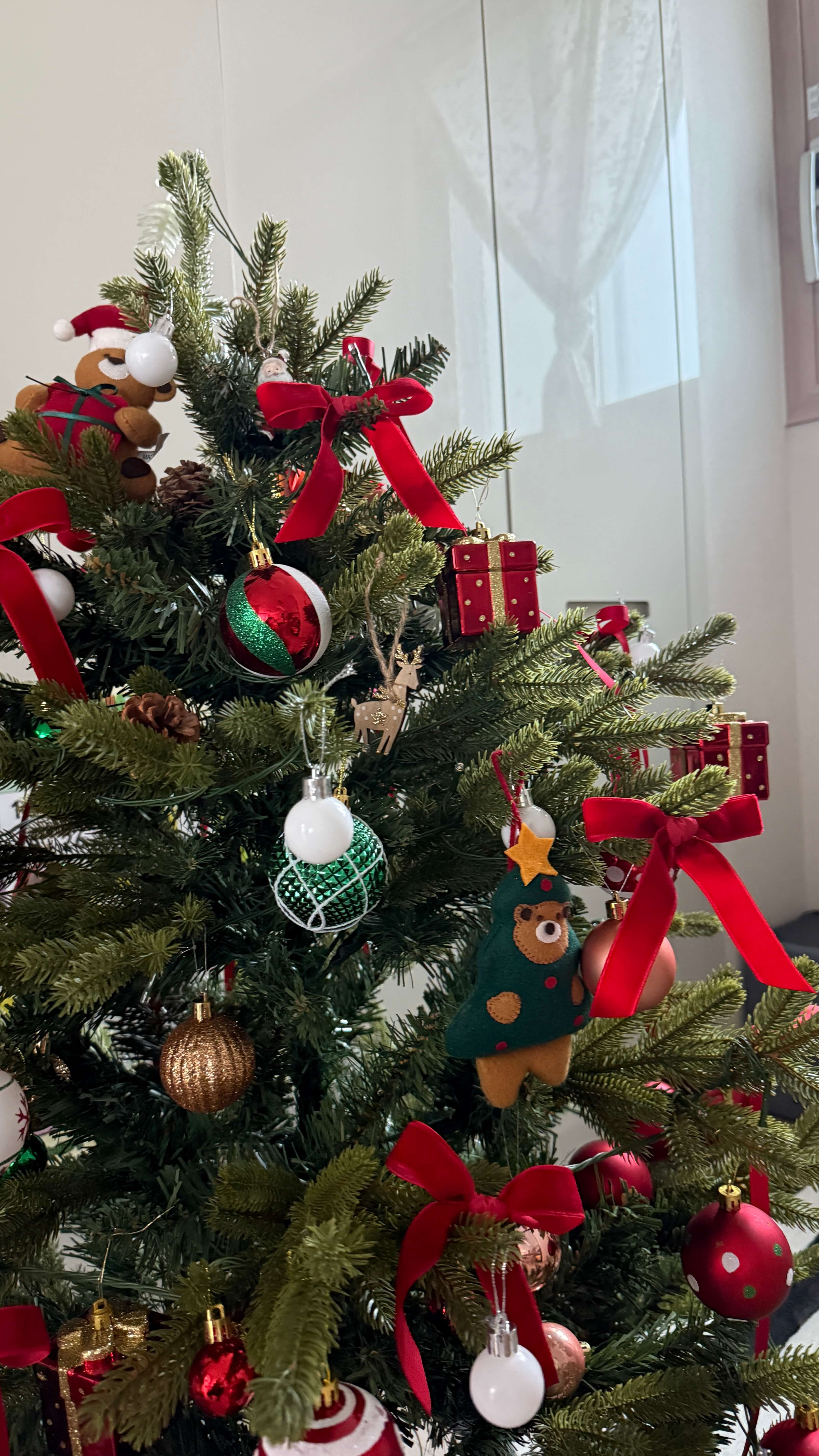 올해 제가 제일 만족한 포인트는 크리스마스 트리 리본이에요. 빨간 벨벳 리본을 따로 사서 직접 만들어 달았는데, 비용 대비 효과가 정말 큽니다. 특히 360도 모두 오너먼트를 달면 비용도 만만치 않은데, 잘 보이는 쪽 위주로 오너먼트를 달고, 뒷면에는 리본으로만 장식해도 예뻤어요!