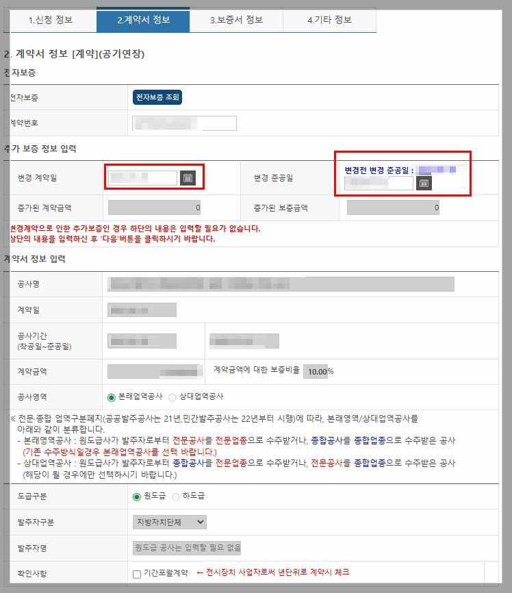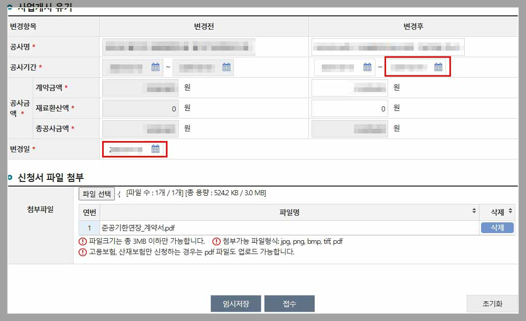 - 변경된 공사명, 공사기간, 계약금액 입력