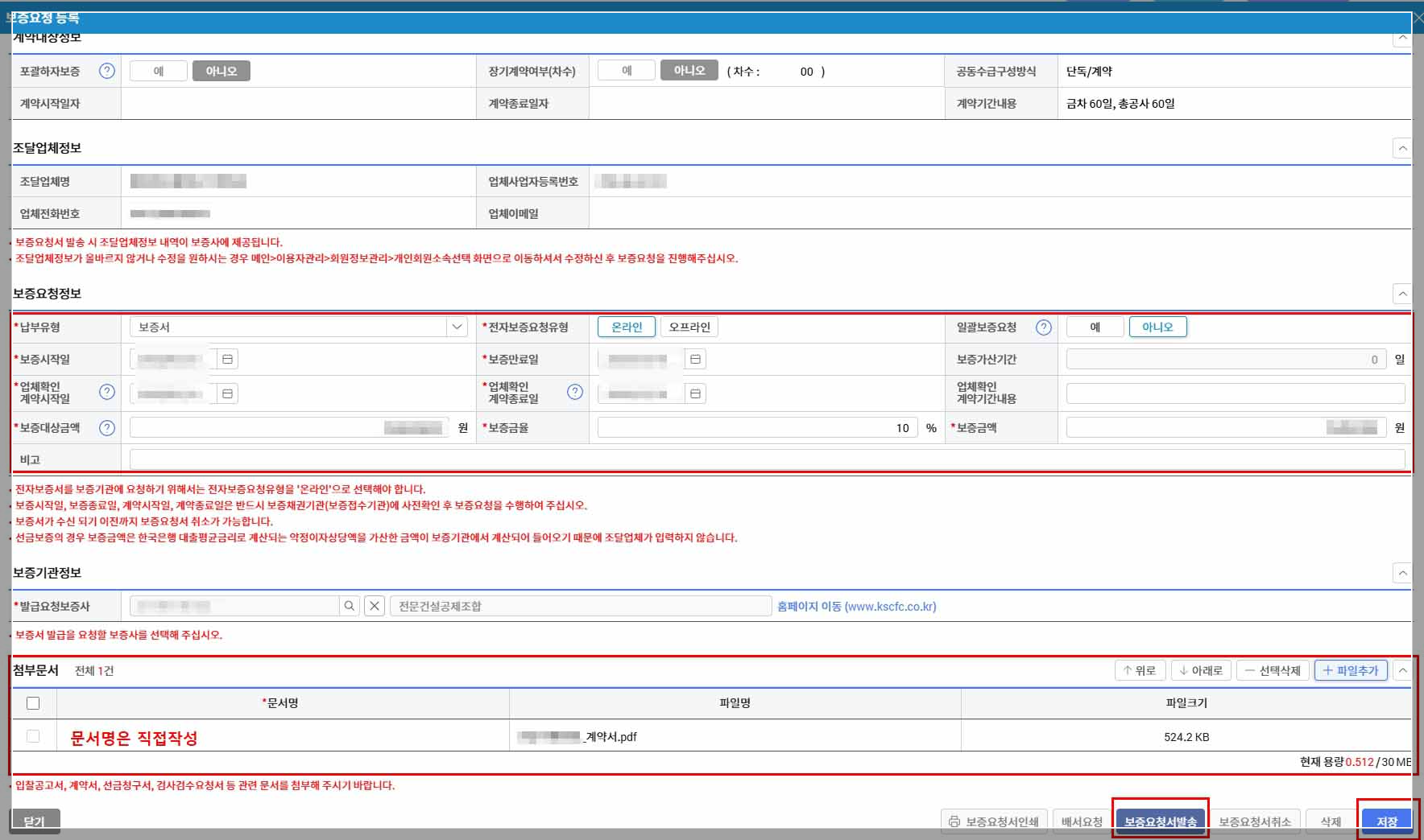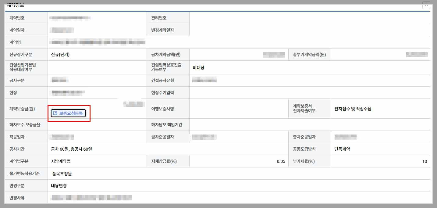- 계약문서 > 업무화면으로 이동 > 보증요청등록
