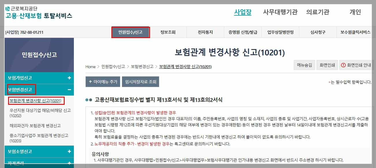 - 민원접수/신고 > 보험관계 변경사항 신고 (10201) 선택