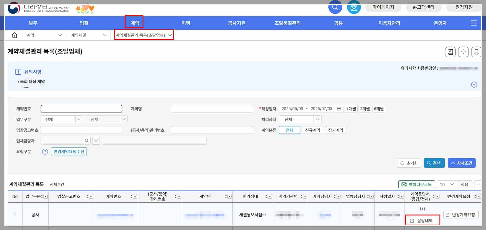 - 나라장터 > 계약 > 계약체결관리목록 > 응답내역 > 보증서수신 확인